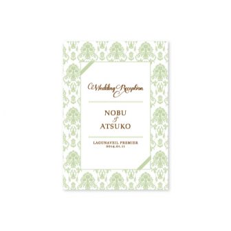 グリーンのダマスク柄のデザイン。2人のヒストリーやゲストへのメッセージなど、ボリュームたっぷりの16ページでおつくりしました。design by ayu