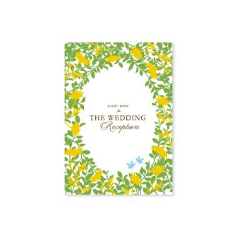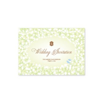 グリーンを基調としたかすみ草のデザイン。表紙にはプロポーズのシルエット、裏表紙には走っている新郎新婦のシルエット、そしてお式のテーマでもある桜をポ…