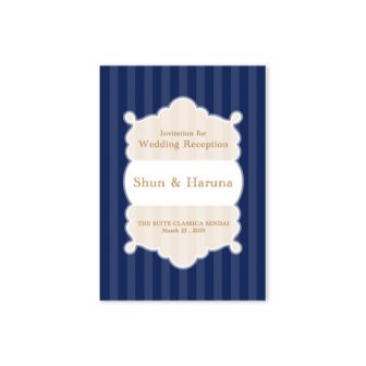 招待状、プロフィールブック・席次表、席札すべて、ネイビーのストライプでおそろいのデザインでおつくりしました。フレームは遊び心のあるデザインに。イニ…